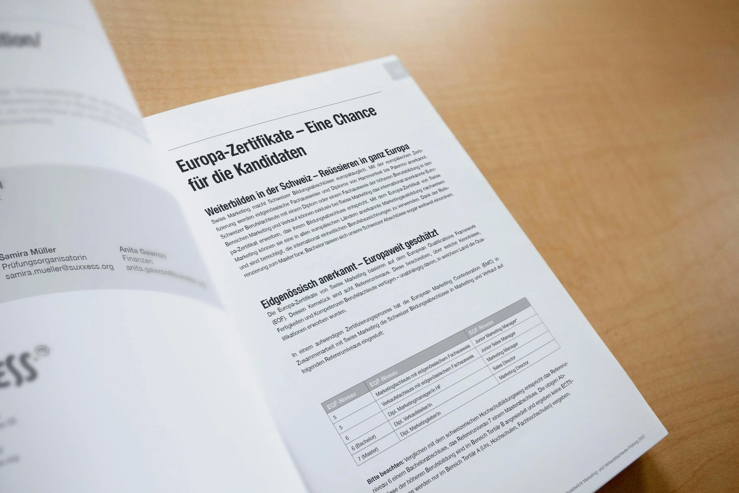 Gestaltung und Layout der Broschüre des Prüfungsberichts für die Marketing- und Verkaufsfachleute. New Media & Design hat zusammen mit Christoph Portmann die neue Broschüre, bestehend aus 40 Seiten, konzipiert, erarbeitet und umgesetzt. Die Prüfungsberichte erscheinen für alle drei Sprachregionen in Deutsch, Französisch und Italienisch.